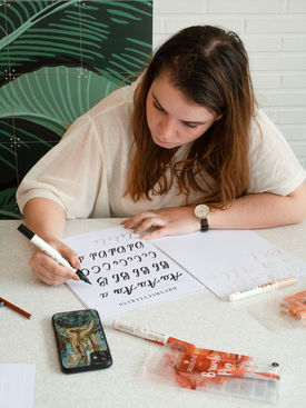 During the workshop I give you tips and tricks to make the whole process easier, and I can see where you're struggling. I also answer all your questions and I challenge you to make a gorgeous piece at the end of each workshop! After this workshop you will have all the confidence to start doing calligraphy! Now we can write each other beautiful letters in calligraphy! I also give this workshop in private, so if you want to learn it on your pace and in the comfort of your home this is the way to do it! After every workshop you will have to practice practice practice to get your writing as smooth and flawless as ever! Hope to see you in class soon!